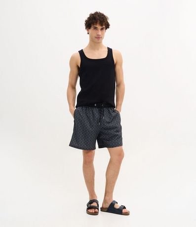 Bermuda masculina confeccionada en microfibra, en modelo playera. Posee cintura elástica, con corazón ajustable, bolsillo y estampado geométrico.