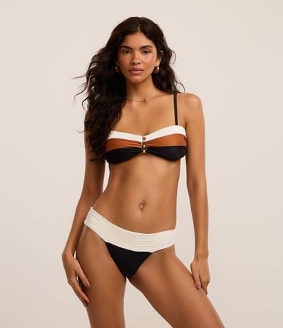 Artículo único de bikini confeccionada en microfibra sin estampa y texturizada. La bombacha canesú larga tiene cintura ancha, contrastante y texturizado.