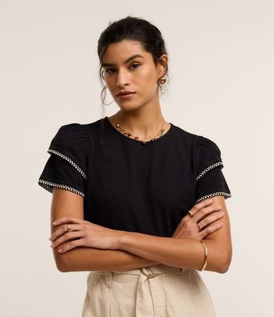 Blusa de mangas cortas con cuello redondo y detalles picotados en efecto ganchillo contrastantes en las mangas. Confeccionada en Algodón más sostenible.
