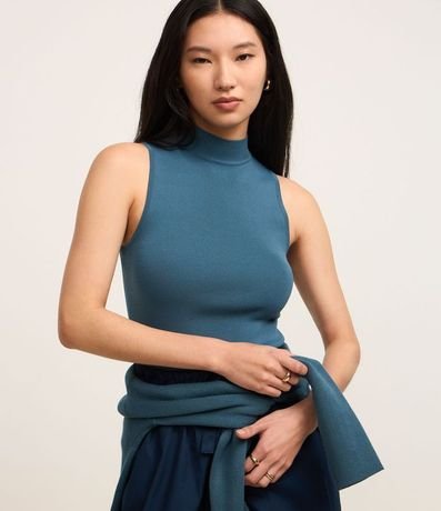 Blusa femenina, confeccionada en punto, con cuello alto, sin manga, textura acanalada y superfície sin estampa.