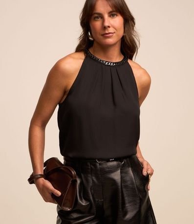 Blusa sin mangas, confeccionada en crepé, con cuello redondo con cadena metalizada y sisas americanas.