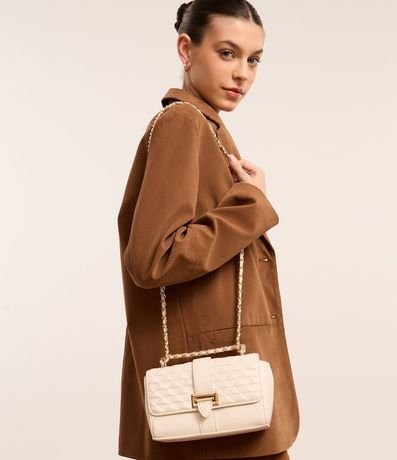 Bolsillo texturizada pequena, modelo femenino, confeccionada en PU, con cierre en hebilla delantero y asas de cadena.