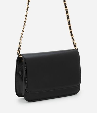 Cartera rectangular femenina, confeccionada en PU, con tapa, asa transversal con cadena, cremallera en la parte interna y botones en el cierre externo.