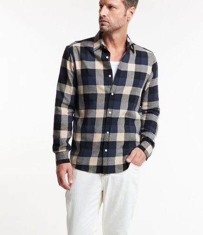 Camisa masculina, modelo comfort, confeccionada en algodón más sostenible, con cuello camisero, mangas largas, abotonado y estampado de cuadros.