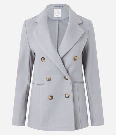 Campera alargada, abertura total, con botones duplos y bolsillos delanteros.