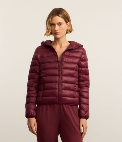 Campera deportiva femenina, confeccionada en tejido tecnológico. La prenda cuenta con capucha, cremallera delantero y gomitas que le dan un efecto puffer.