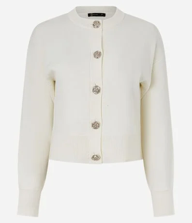 Cardigan en tricot con modelo regular, cuello redondo y acabado rectilíneo, contiene cierre delantero por botones florales metálicos. La prenda posee mangas largas, superfície lisa y estructura cómoda, ofreciendo versatilidad para componer looks casuales o sofisticados.