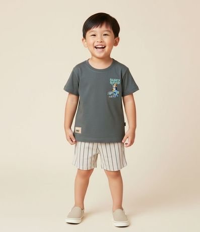 Conjunto infantil Bluey con Remera en Media malla y estampa localizada, cuello redondo y manga corta. Bermuda rayada con elástico en la cintura y cordón ajustable. Confeccionado en algodón certificado BCI y buenas prácticas ambientales, garantizando comodidad y moda responsable.