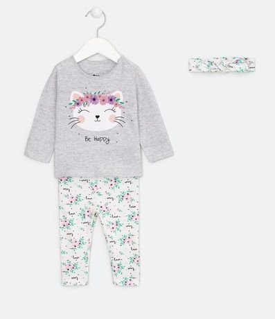 Conjunto Infantil Blusa Estampada Gatita con Flores Pantalón Floral y Diadema - Tam 0 a 18 meses 1