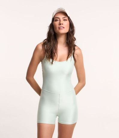 Enterito deportivo femenino, confeccionado en poliamida, con breteles finos, textura acanalada y escote U en la espalda.