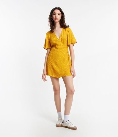 Enterito de viscosa con escote cruzado en pico V, mangas cortas amplias y estampa de mini lunares.