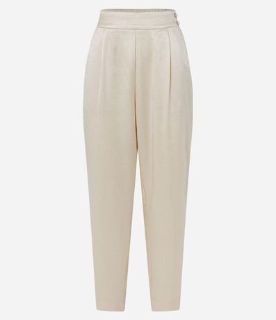 Pantalón de satén, modelo zanahoria, con pliegues y bolsillos. La cintura es alta, con con botones de perlas artificiales y con elástico en la parte delantera.