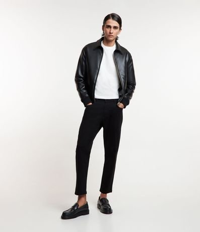 Pantalón slim masculina, confeccionada en sarga, con trabillas en la cintura y bolsillos.