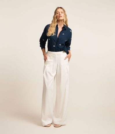 Pantalón pantalona, ajuste sastrería, con cierre desplazado con botón en el lateral, confeccionada en sarga y sin estampa.