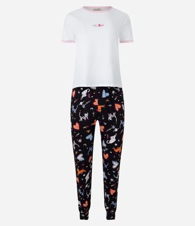 Pijama Largo con Blusa Bordada y Pantalón Estampado de Gatitos 1