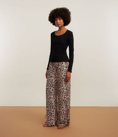 Pijama Largo en Rib con Pantalón Estampa de Leopardo y Lazo | Renner