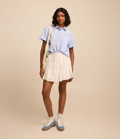 Pollera corta confeccionada en viscosa texturizada con recortes fruncidos, con elástico en la cintura.