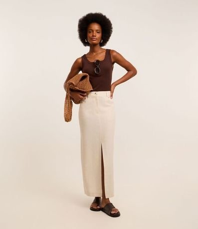 Pollera larga recta, confeccionada en viscolino. Prenda con trabillas en la cintura, cierre tradicional, bolsillos y abertura central en la parte delantera.