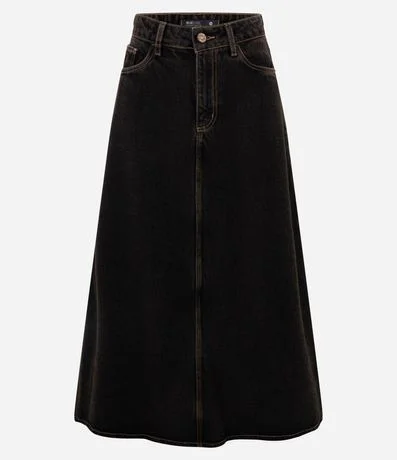 Pollera midi confeccionada en jeans de algodón certificado BCI, ofreciendo estructura encorpada y caída moderna. Posee cintura mediana, bolsillos funcionales, painel delantero con costura central y acabado sobretinto Black Coffee, criando visual urbano y versátil para composiciones casuales.