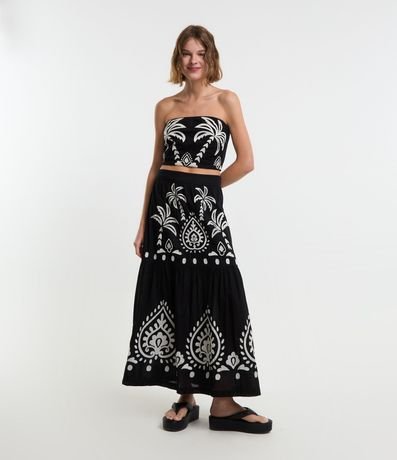 Pollera femenina en modelo new midi, con cierre por cremallera en el lateral y estampa de arabescos y palmeras.