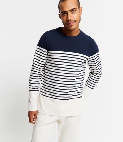 Remera masculina confeccionada en algodón, con cuello redondo, mangas largas y estampado rayada.