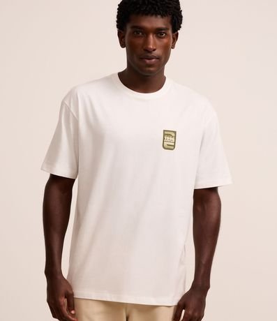 Remera masculina confeccionada en algodón más sostenible con buenas prácticas ambientales en modelo relaxed, cuello redondo, manga corta con estampa de ícones de acampar, estampa localizada delantero y estampa lettering trasera "We Don't Escape Reality "