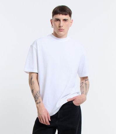 Remera relaxed en algodón, con cuello ligeramente alto, mangas cortas, sisas desplazadas y sin estampado.