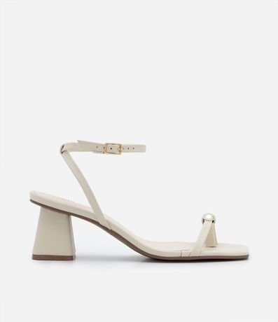 Sandalia femenina con tiras finas, puntera cuadrada, adorno metálico, cierre por hebilla en el tobillo y taco mediano ancho.