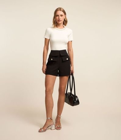 Short sastrería, modelo recto, con tiro alto, cintura con solapa, bolsillo cargo con botón y cierre trasero por cremallera.